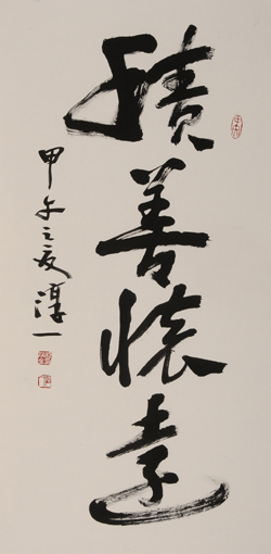 茂全的書法沉穩(wěn)靈動,結(jié)構(gòu)嚴(yán)謹(jǐn);行筆灑脫流暢,成竹在胸,積四十余年的功夫在里面,可以說是修來的果、悟出的道、品出的禪,個中三昧,得之不易。溥杰先生為其題詞“味從勤里得!笔拕谙壬Q之為“后起之秀”。大康先生送字三個,叫“池水墨”,涮筆洗硯竟至池水如墨,功夫下到這份上,能無得乎?