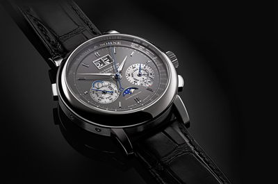 Perpetual的特色之一,這次更搭配18K黃金鍍銠棒形小時刻度、時針和分針。計時指針顯示出準(zhǔn)確至五分之一秒的停動時間,并由藍鋼打造而成。積分盤和秒針亦選用了相同材質(zhì),在小表盤的銀灰色背景上格外醒目。由556個精細零件組成的機芯,進一步印證了來自薩克森的朗格表廠在復(fù)雜制表裝置領(lǐng)域的精湛技藝。