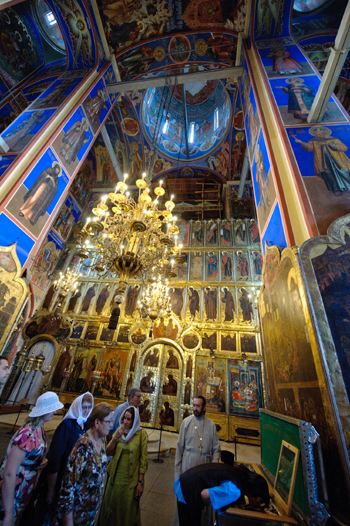 圖為游客在蘇茲達爾城克里姆林宮基督誕生大教堂內參觀、祈禱。資料照片 |
