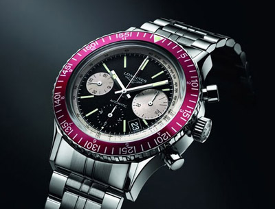 1967)的靈感來自一枚于1967年出產(chǎn)的潛水員腕表,酒紅色潛水刻度表圈與黑色光滑表盤和銀色計時盤形成鮮明對比,并同時配備測速刻度。其原型表款現(xiàn)收藏于浪琴表位于索伊米亞(Saint-Imier)的鐘表博物館中。