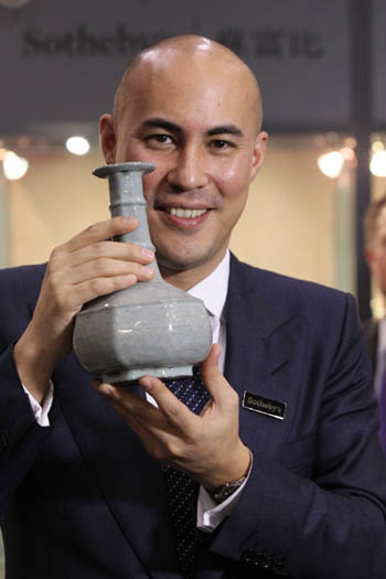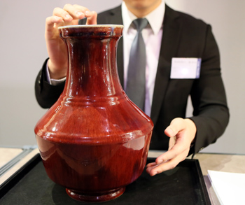 這是香港蘇富比工作人員在春拍預(yù)展上向賣家展示清雍正窯變釉弦紋盤口瓶。記者 李鵬