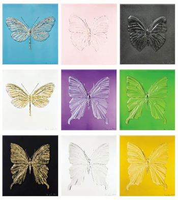 達(dá)米恩·赫斯特:我視蝴蝶為靈魂,也是廣泛被使用的世界視覺語言。我經(jīng)常形容蝴蝶是宇宙的啟發(fā)者,每一個人都會愛上它那不可思議的脆弱美態(tài)。對我來說,蝴蝶另一個吸引的元素,就是那種介乎于生日賀卡上被大眾喜愛的形象、愛的力量,以及昆蟲本身真實存在的矛盾張力。我們往往嘗試?yán)米匀粊肀磉_(dá)一些難以言傳的意念:愛、欲望、信念和永恒,蝴蝶正好是一個有趣的例子。其實這些都是既定的意念,基督教便經(jīng)常利用蝴蝶來表現(xiàn)復(fù)活;古希臘用來代表靈魂。我最喜愛蝴蝶無論生前死后都是一模一樣,但當(dāng)光線穿透這些版畫時,它們就像以另一種形態(tài)復(fù)活了。