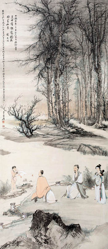 《羲之換鵝圖》畫作碩大,品相極佳,以1955萬元成交。畫的內(nèi)容為傳說晉代書圣王羲之以書作換鵝的故事。兩侍女前方正襟危坐著當(dāng)為書圣。此三人工筆繪之,極為生動傳神。畫面上部所繪為樹木、樹干挺拔,占畫面大半,似為冬日景象。此幅表現(xiàn)了作者憑借描繪人物及樹木的高超技藝,營造出平靜疏朗的氛圍。從畫面風(fēng)格和題款來看,此幅應(yīng)為大千三十年代中后期的重要創(chuàng)作。