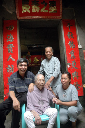 104歲的海口市民葉吳氏和兒媳鄭玉金(后)及孫兒孫媳一起在家門口留影。有專家稱,我國已邁入老齡化社會。彭桐