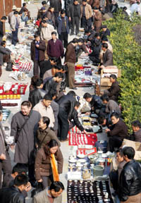 據(jù)了解,目前全國(guó)各地大大小小的古玩市場(chǎng)不下幾百個(gè),多數(shù)由解放前就一直存在的舊貨市場(chǎng)自發(fā)轉(zhuǎn)化而來(lái)。最初,這些市場(chǎng)堪稱(chēng)自由市場(chǎng),舊書(shū)字畫(huà)、古董工藝品,無(wú)所不賣(mài)。漸成氣候以后,有人稱(chēng)它們?yōu)榕f貨市場(chǎng),也有人稱(chēng)之為工藝品市場(chǎng)、還有的叫它文化市場(chǎng)。在太原的南宮市場(chǎng),如今不僅有地?cái)偅有裝修氣派的收藏文化廣場(chǎng)大樓。但認(rèn)真考察就會(huì)發(fā)現(xiàn),工藝品、仿制品、舊貨、小玩意兒……包羅萬(wàn)象,似乎哪個(gè)稱(chēng)謂都無(wú)法明確概括它們的實(shí)際狀況。