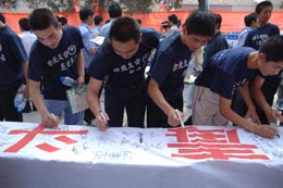 6月26日,山東省和濟南市禁毒委員會在濟南市濟南戰(zhàn)役紀念館廣場聯(lián)合舉辦“禁毒與健康”禁毒宣傳活動。活動通過展板、實物、案例介紹等形式引導群眾認識吸毒的危害、遠離毒品、樹立正確的健康理念。圖為參加“禁毒與健康”禁毒宣傳活動的濟南市民在禁毒宣傳橫幅上簽字。 新華社記者:徐速繪