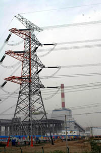 寧夏首臺600MW燃煤空冷發(fā)電機組采用世界上最先進的空冷發(fā)電技術(shù),較傳統(tǒng)濕冷發(fā)電機組節(jié)水70%,是典型的環(huán)保發(fā)電機組。圖為華電寧夏靈武發(fā)電有限公司院內(nèi)的輸電網(wǎng)。