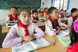 2007年,上海市教委將改善農(nóng)民工子女學(xué)校辦學(xué)條件列入年度重點(diǎn)工作。11月13日,上海浦東新區(qū)大別山小學(xué)農(nóng)民工的孩子們?cè)谟⒄Z(yǔ)課上朗讀單詞。新華社記者:鄭悅