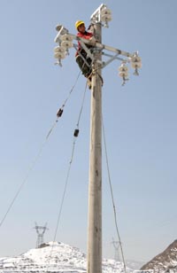 2月22日,在云南省昭通市,一名工人在搶修冰雪災(zāi)害中損壞的電力設(shè)施。