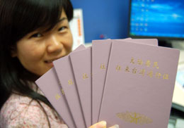7月3日,國旅總社的工作人員向記者展示臺(tái)灣游首發(fā)團(tuán)游客的《大陸居民往來臺(tái)灣通行證》。目前大陸游客必須持有此證和相應(yīng)簽注才能前往臺(tái)灣旅游。 大陸居民赴臺(tái)旅游首發(fā)團(tuán)共有約760名團(tuán)員將于7月4日搭乘首航兩岸周末包機(jī),由北京、上海、南京、廈門、廣州五地陸續(xù)啟程。目前,相關(guān)旅游業(yè)者均表示已做好準(zhǔn)備。新華社記者:張舵