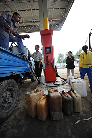 | 幾戶農(nóng)民在拿著大大小小的油桶在黑龍江省方正縣高號(hào)加油站加柴油。本報(bào)記者