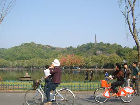 租騎公共自行車在杭州白堤游玩的游客。本報(bào)記者:孫金霞