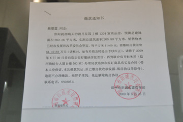 連日來,所有購房人分別收到了溫州市舊城改建指揮部的《繳款通知書》,限定他們于6月30日前繳納房款差價,每平方米大多需繳款3000元以上,繳款后簽訂房屋買賣合同,逾期不辦理繳款、結(jié)算手續(xù)的,依法解除購房協(xié)議。