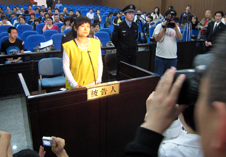 今年4月16日,浙江省金華市中級(jí)人民法院一審首次開(kāi)庭,審理被稱為“東陽(yáng)富姐”的吳英涉嫌集資詐騙3.8億余元案件。圖為吳英出庭受審。本報(bào)記者黃深鋼攝 |