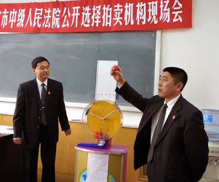4月3日,在哈爾濱市中級法院選擇拍賣機構(gòu)現(xiàn)場會上,四起案件的申請執(zhí)行人用搖號的方式選擇拍賣機構(gòu)。用搖號方式選擇拍賣機構(gòu)在黑龍江省內(nèi)法院尚屬首次,使強制執(zhí)行標(biāo)的物的拍賣工作變得更加陽光透明。
