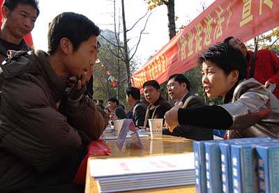 12月2日,余姚市勞動部門工作人員(右)在受理一名男青年的咨詢。當(dāng)天是浙江省余姚市規(guī)定的“外來務(wù)工人員日”,為了配合即將頒布的新《勞動合同法》宣傳,余姚市工會及勞動和社會保障部門的法律專家走上街頭,義務(wù)為外來務(wù)工人員宣傳新法,并提供咨詢服務(wù)。