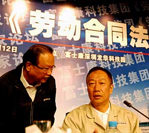 | 富士康科技集團(tuán)12日在深圳舉行《勞動合同法》專題論壇,邀請勞動部、國臺辦、全國總工會等相關(guān)部門的專家解答了企業(yè)和員工的疑問。富士康表示,將積極實(shí)施《勞動合同法》,與數(shù)萬已連續(xù)工作8年以上的員工簽訂無固定期限勞動合同。富士康科技集團(tuán)總裁郭臺銘(右者)在研討會上表示,富士康將積極實(shí)施《勞動合同法》,全力推動有富士康特色的勞動合同制度,創(chuàng)造勞資雙贏、留住人才的局面,同時(shí)積極履行《勞動合同法》規(guī)定的法律責(zé)任,做到合法經(jīng)營。新華社記者