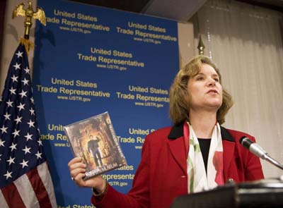 2007年4月9日,美國貿易代表蘇珊·施瓦布在華盛頓舉行的新聞發(fā)布會上展示一張電影《博物館之夜》的盜版DVD。當天,蘇珊·施瓦布宣布,美國政府向世界貿易組織提出了針對中國的兩項貿易訴訟,分別指責中國打擊盜版不力和限制美國電影、音樂和圖書產品進入本國市場。新華社/法新 |