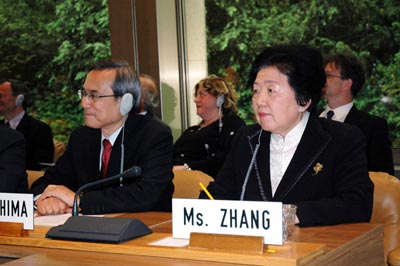 2008年5月20日,中國律師張月姣(右)在瑞士日內瓦世界貿易組織總部參加就職儀式。張月姣當天正式宣誓就任世貿組織上訴機構法官。 新華社記者劉國遠
