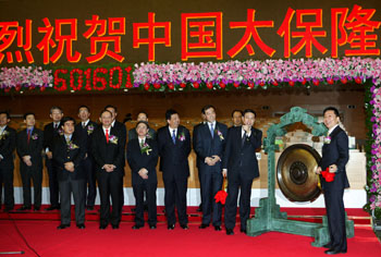 自1979年國(guó)內(nèi)恢復(fù)保險(xiǎn)業(yè)務(wù)至今,我國(guó)保險(xiǎn)市場(chǎng)規(guī)模增長(zhǎng)了2000多倍,成為新興保險(xiǎn)大國(guó)。圖為中國(guó)太平洋保險(xiǎn)(集團(tuán))公司董事長(zhǎng)高國(guó)富(右一)為A股股票上市鳴鑼。新華社發(fā) |