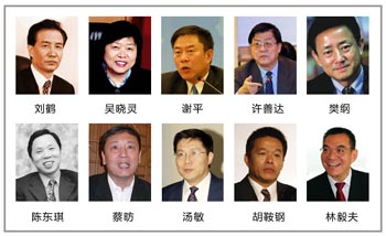 這10位經(jīng)濟學家分別是:中央財經(jīng)領導小組辦公室副主任劉鶴、中國人民銀行原副行長吳曉靈、中央?yún)R金投資有限公司總經(jīng)理謝平、國家稅務總局原副局長許善達、中國改革基金會國民經(jīng)濟研究所所長樊綱、中國發(fā)展與改革委員會宏觀研究院副院長陳東琪、中國社會科學院人口與勞動研究所所長蔡昉、中國發(fā)展研究基金會副秘書長湯敏、清華大學公共管理學院教授胡鞍鋼以及北京大學原中國經(jīng)濟中心主任、現(xiàn)任世界銀行副行長林毅夫。