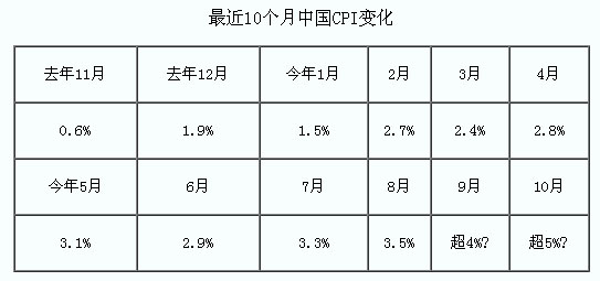 然而,4萬億的中央投資計(jì)劃、十大產(chǎn)業(yè)振興規(guī)劃,以及10萬億的新增貸款投放,極大地刺激了中國(guó)經(jīng)濟(jì)的快速?gòu)?fù)蘇與CPI的持續(xù)反彈。自2009年11月以來,中國(guó)CPI已連續(xù)上漲10個(gè)月,并有不斷攀升之勢(shì)。