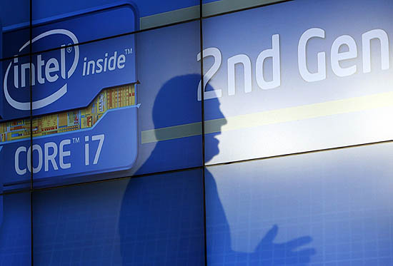 | 1月5日,在美國拉斯韋加斯國際消費電子展的英特爾新聞發(fā)布會上,英特爾總裁保羅·奧特里尼的身影投射到墻上。新華社/路透 |