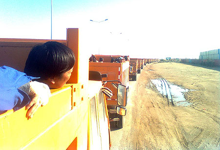 | 2月26日,中鐵十一局五公司組織員工撤離利比亞鐵路項目工地,分乘數十輛工程車,組成車隊前往利比亞米蘇拉塔港。新華社發(fā)(梁勝利