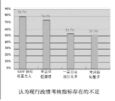 總的來看,大多數(shù)受訪廳局級領(lǐng)導(dǎo)干部認(rèn)為現(xiàn)有政績考核方式不利于轉(zhuǎn)變經(jīng)濟(jì)發(fā)展方式。那么,現(xiàn)行考核方式中存在哪些不足呢?調(diào)查結(jié)果顯示,78.7%的領(lǐng)導(dǎo)干部認(rèn)為“反映GDP增值的指標(biāo)權(quán)重太大”。74.7%的領(lǐng)導(dǎo)干部選擇“重顯績輕潛績”,致使有些地方熱衷做“表面文章”,民眾無法有效共享發(fā)展的成果。53.7%的領(lǐng)導(dǎo)干部選擇“‘一票否決’項目太多”,地方領(lǐng)導(dǎo)有時畏手畏腳,難以全力以赴推動轉(zhuǎn)變經(jīng)濟(jì)發(fā)展方式。51.9%的領(lǐng)導(dǎo)干部選擇“考評指標(biāo)繁多”。