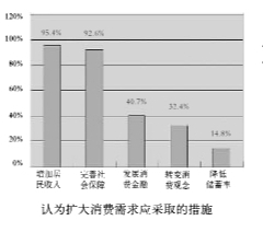 國際經(jīng)驗證明,需求是一個國家經(jīng)濟(jì)增長的根本動力,轉(zhuǎn)變經(jīng)濟(jì)發(fā)展方式,必須有利于實現(xiàn)居民消費(fèi)率逐步提高,實現(xiàn)由外需為主向內(nèi)需為主的轉(zhuǎn)型。95.4%的領(lǐng)導(dǎo)干部指出“增加居民的勞動收入和財產(chǎn)性收入,尤其是中低階層的收入”是擴(kuò)大消費(fèi)需求的重要途徑。92.6%的領(lǐng)導(dǎo)干部選擇“完善社會保障制度,實現(xiàn)基本公共服務(wù)均等化”,說明完善公共服務(wù),解除居民的后顧之憂,能夠有力刺激居民消費(fèi)。40.7%的領(lǐng)導(dǎo)干部認(rèn)同“鼓勵金融創(chuàng)新,發(fā)展消費(fèi)金融,刺激居民消費(fèi)”,表明通過消費(fèi)信貸提升居民的消費(fèi)能力大有可為。32.4%的領(lǐng)導(dǎo)干部認(rèn)可“轉(zhuǎn)變居民傳統(tǒng)的消費(fèi)理念,鼓勵他們敢于花錢”。另有14.8%的領(lǐng)導(dǎo)干部認(rèn)為“降低儲蓄利率,降低居民的儲蓄傾向,鼓勵他們增加消費(fèi)”。