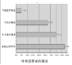 “十二五”期間是否應(yīng)該實行省直管縣的行政體制,42.6%的領(lǐng)導(dǎo)干部認(rèn)為應(yīng)“根據(jù)各地區(qū)實際情況區(qū)別對待,不宜在全國采取同一種模式”。35.2%的領(lǐng)導(dǎo)干部認(rèn)為“具備條件,并且應(yīng)當(dāng)作為‘十二五’行政體制改革的重點之一”。27.8%的領(lǐng)導(dǎo)干部認(rèn)為“條件尚不成熟,可以試點推進(jìn),但是不宜全面鋪開”。4.6%的領(lǐng)導(dǎo)干部認(rèn)為“這項改革弊大于利,不能繼續(xù)推進(jìn)”。