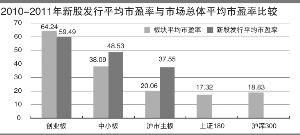 圖二:2010-2011年新股發(fā)行平均市盈率與市場總體比較
