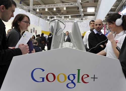參觀者在2012年德國(guó)漢諾威信息及通信技術(shù)博覽會(huì)谷歌展臺(tái)參觀。資料照片 |