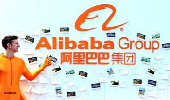 3月17日,德國漢諾威通信和信息技術(shù)博覽會(huì)中國展區(qū)阿里巴巴展臺(tái)展示參觀者留言寄語墻板。 記者