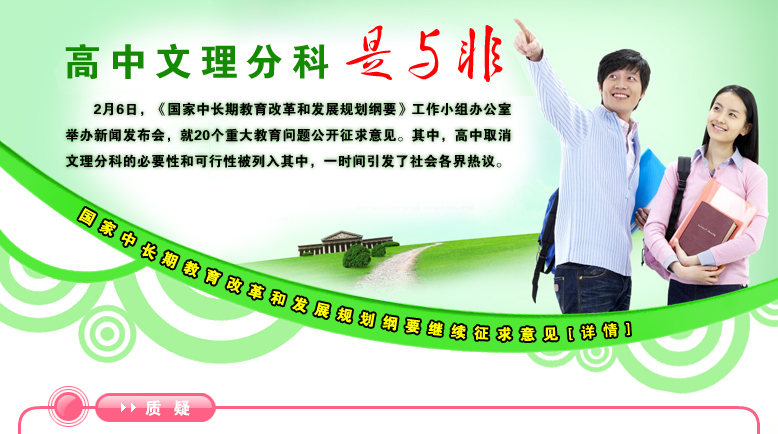 文理分科制度,始于1977年恢復(fù)高考,但分科教育的歷史淵源可追溯至新中國(guó)建立初期。當(dāng)時(shí),我國(guó)的教育很大程度上模仿了“蘇聯(lián)模式”。按照蘇聯(lián)的模式,教育要培養(yǎng)專才,知識(shí)的學(xué)習(xí)都朝著專業(yè)化路子邁進(jìn)。學(xué)科有分化的趨勢(shì),大學(xué)也有了“分學(xué)”的傳統(tǒng)。同樣為適應(yīng)專業(yè)教育,恢復(fù)高考后,高中開始了文理分科。 上世紀(jì)末,受歐美國(guó)家教育理念影響,大學(xué)也由“分學(xué)”的傳統(tǒng)走出,有了“合并”的趨勢(shì)。與此同時(shí),通識(shí)教育、素質(zhì)教育理念也被人們大肆提倡。取消文理分科,因此而有了思想上的背景。[詳情] | | |
