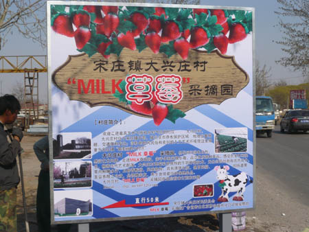 通州移動(dòng)公司為大興莊樹的草莓采摘園廣告宣傳牌。這是村官孫璐珺與通州區(qū)移動(dòng)公司“談判”的成果。