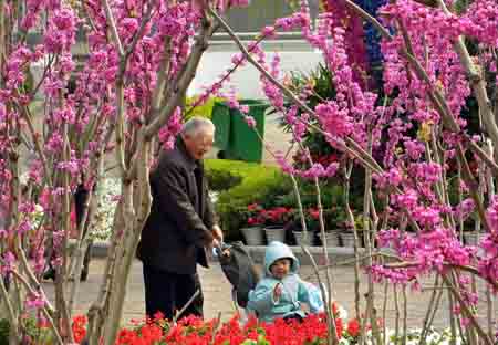 一位推著童車(chē)的老人從一片紫荊花前經(jīng)過(guò)。新華社記者:王頌