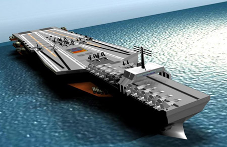 | 網(wǎng)友設(shè)計的中國海軍航母想象圖。 | 【中央軍委委員、海軍司令員吳勝利上將日前在接受新華網(wǎng)采訪時透露,中國海軍將研制新一代艦艇飛機(jī)。要進(jìn)一步加大裝備的現(xiàn)代技術(shù)含量,必須加快推進(jìn)重點武器裝備建設(shè)步伐,研制大型水面戰(zhàn)斗艦艇等新一代武器裝備。此前,中國國防部長梁光烈2009年3月20日與到訪的日本防衛(wèi)大臣濱田靖一會談時表示,中國是唯一沒有航母的大國,中國不可能永遠(yuǎn)不擁有航母。這樣的表態(tài)被海外媒體解讀成是中國政府首次公開宣布航母建造計劃。據(jù)有關(guān)專家估算,如果中國建造一艘自用的航空母艦,并為其配備完整的戰(zhàn)斗編隊,恐將花費上百億元。在當(dāng)前這個國際經(jīng)濟(jì)不振、國內(nèi)經(jīng)濟(jì)面臨考驗的時候,上百億元的采購大單,毫無疑問會對中國經(jīng)濟(jì)起到助推和加速作用。】