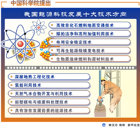 能源科技發(fā)展路線圖提出了十個(gè)旨在引領(lǐng)我國(guó)能源科技發(fā)展、造就中國(guó)特色新型能源工業(yè)、滿足經(jīng)濟(jì)社會(huì)發(fā)展需求的重要技術(shù)方向,包括高效非化石燃料地面交通技術(shù)、煤的潔凈和高附加值利用技術(shù)、電網(wǎng)安全穩(wěn)定技術(shù)、可再生能源規(guī)模發(fā)電技術(shù)、生物質(zhì)液體燃料和原材料技術(shù)、深層地?zé)峁こ袒夹g(shù)、氫能利用技術(shù)、天然氣水合物開(kāi)發(fā)與利用技術(shù)、新型核電與核廢料處理技術(shù)、具有潛在發(fā)展前景的能源技術(shù)。