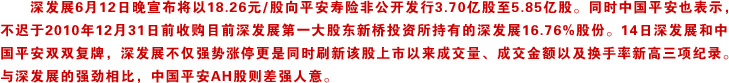 中國平安: 深發(fā)展品牌目前不會有任何改變 深發(fā)展將來會不會被整合到中國平安之中而導(dǎo)致退市,成為此次收購案的最大懸念之一。對此,雙方均表示討論這個問題為時過早,尚沒有明確計劃以及時間表來處理平安銀行和深發(fā)展的整合。[詳細(xì)] |