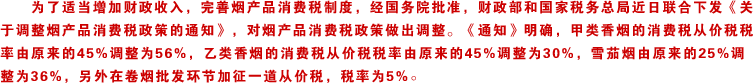 | 此次上調(diào)煙草稅包括三方面的內(nèi)容:上調(diào)煙草生產(chǎn)環(huán)節(jié)的消費稅、在卷煙環(huán)節(jié)加征5%的從價稅和調(diào)整了計稅價格。甲類香煙的消費稅從價稅率由45%調(diào)至56%。原來的甲乙類香煙劃分標(biāo)準(zhǔn)也進行了調(diào)整,原來50元的分界線上浮至70元。[詳細] | |
