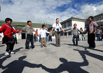 中華慈善總會(huì)兒童基金會(huì)的志愿者與拉薩兒童福利院的孩子們做游戲。新華社記者:覺果