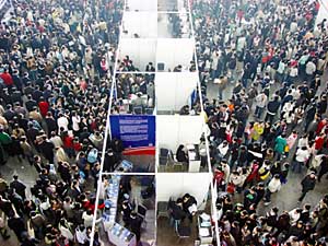 十一月二十日,江蘇省首場(chǎng)面向二〇〇八屆高校畢業(yè)生的招聘會(huì)現(xiàn)場(chǎng)依然人山人海。本報(bào)記者