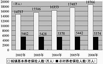 目前,養(yǎng)老保險(xiǎn)已經(jīng)實(shí)現(xiàn)廣覆蓋。到2006年底,全國(guó)基本養(yǎng)老保險(xiǎn)參保人數(shù)為18766萬(wàn)人,城鎮(zhèn)參加企業(yè)基本養(yǎng)老保險(xiǎn)覆蓋率達(dá)到76%。而且,基本養(yǎng)老金正常調(diào)整機(jī)制建立了起來(lái)。1998—2005年,企業(yè)參保離退休人員人均養(yǎng)老金水平由每月413元增加到719元,年均增長(zhǎng)8.2%。2006年,中央決定較大幅度地提高企業(yè)退休人員基本養(yǎng)老金,當(dāng)年月人均養(yǎng)老金達(dá)到815元。另外,統(tǒng)籌層次正逐步穩(wěn)定提高。截至2006年底,全國(guó)已有北京、天津、吉林、黑龍江、上海、福建、重慶、云南、陜西、甘肅、青海、寧夏、新疆13個(gè)省區(qū)市實(shí)現(xiàn)了省級(jí)統(tǒng)籌。但是,農(nóng)村養(yǎng)老保險(xiǎn)的推進(jìn)比較緩慢,覆蓋面還比較小。