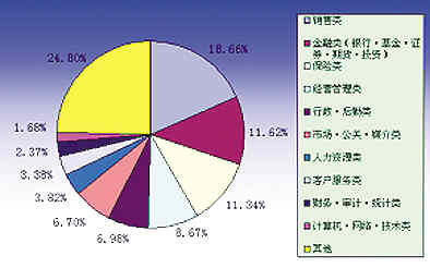 中華英才網(wǎng)“獵頭在線”人力資源專家鄭嘯告訴《市場(chǎng)報(bào)》記者,金融行業(yè)目前招聘的職位主要是銷售類、金融類、保險(xiǎn)類和經(jīng)營(yíng)管理類人才。具體從職業(yè)分布情況來看,保險(xiǎn)類的供求比例差距比較大,企業(yè)對(duì)保險(xiǎn)類人才的需求較多,而市場(chǎng)上該類人才的供應(yīng)量相對(duì)較少。