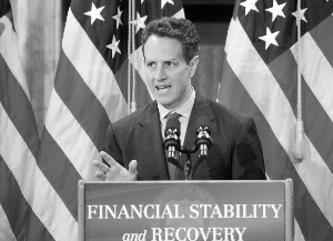 | 10日,美財(cái)長(zhǎng)蓋特納在財(cái)政部宣布新的金融救援計(jì)劃。新華社/路透 | 與上任前的咄咄逼人相比,奧巴馬政府在對(duì)人民幣匯率問(wèn)題上的立場(chǎng)正悄悄作出調(diào)整。在本周二的一次電視采訪中,新上任的美國(guó)財(cái)長(zhǎng)蓋特納坦言,政府尚未對(duì)中國(guó)是否“操縱匯率”作出最終判斷,并稱(chēng)在此事上當(dāng)局會(huì)“小心行事”。這與他上月在國(guó)會(huì)大談“人民幣匯率操縱”的立場(chǎng)形成鮮明對(duì)照。不僅如此,上任不過(guò)三周的蓋特納已兩次致電中國(guó)國(guó)務(wù)院副總理王岐山,強(qiáng)調(diào)兩國(guó)繼續(xù)保持密切對(duì)話“尤其重要”。