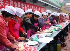 11月21日,農(nóng)民選手們在參加“水餃制作”比賽。當日,由西安市勞動局舉辦的“農(nóng)民技能大比武”在未央?yún)^(qū)八興灘村舉行,來自40多個村、經(jīng)過一個月免費培訓的230多名農(nóng)民選手,參加了“手工編織”“鍋貼制作”“水餃制作”“手工面制作”等項目的比賽。