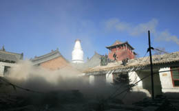 1月11日,在山西省忻州市五臺(tái)山景區(qū),工人們?cè)谖迮_(tái)山大白塔下拆除房屋。為保護(hù)中國(guó)四大佛教圣地之一五臺(tái)山的“佛國(guó)”氛圍,中國(guó)已啟動(dòng)一項(xiàng)大規(guī)模的拆遷工程,使?jié)庵氐纳虡I(yè)氣息從五臺(tái)山逐漸淡出,同時(shí)也為申報(bào)2008年世界自然和文化“雙遺產(chǎn)”做好準(zhǔn)備。五臺(tái)山位于中國(guó)山西省的北部,梵宮琳宇構(gòu)成了東亞乃至世界現(xiàn)存最龐大的佛教古建群,僅五臺(tái)內(nèi)現(xiàn)存完好的寺院就有47座,為中國(guó)最早、最大的國(guó)際性佛教道場(chǎng)。 |