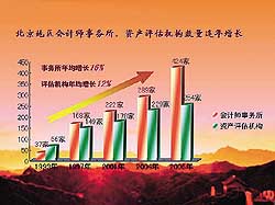 北京注協(xié)以高度的責(zé)任感和使命感,以科學(xué)的管理意識(shí)和誠信務(wù)實(shí)的工作作風(fēng),引領(lǐng)北京注冊(cè)會(huì)計(jì)師、注冊(cè)資產(chǎn)評(píng)估師行業(yè)朝著良性發(fā)展的方向發(fā)展,行業(yè)規(guī)模得以迅速壯大,位居全國行業(yè)領(lǐng)先地位。截至2006年底,北京注協(xié)共有會(huì)計(jì)師事務(wù)所428家,注冊(cè)會(huì)計(jì)師10799人,分別比上年增長15%和8%;資產(chǎn)評(píng)估機(jī)構(gòu)254家,注冊(cè)資產(chǎn)評(píng)估師2938人,分別比上年增長9%和6%;2005年度行業(yè)收入合計(jì)44.6億元,其中會(huì)計(jì)師事務(wù)所業(yè)務(wù)收入39.7億元,資產(chǎn)評(píng)估機(jī)構(gòu)業(yè)務(wù)收入4.9億元,比上年增長21%。在中國注冊(cè)會(huì)計(jì)師協(xié)會(huì)公布的2006年全國會(huì)計(jì)師事務(wù)所業(yè)務(wù)收入排名“百強(qiáng)”中,北京地區(qū)占據(jù)42家,其中7家進(jìn)入前10名。自2000年以來,業(yè)務(wù)收入連續(xù)位居全國前列,各種特種執(zhí)業(yè)資格亦獨(dú)占鰲頭。