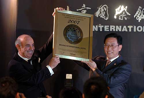 4月1日,北京國際飯店總經(jīng)理陳旭華(右)接受美國優(yōu)質(zhì)服務(wù)科學學會主席約瑟夫·欽奎頒發(fā)的“國際五星鉆石獎”獎牌。當日,北京國際飯店榮獲“國際五星鉆石獎”頒獎晚會在北京舉行!皣H五星鉆石獎”是由美國優(yōu)質(zhì)服務(wù)科學學會頒發(fā)的國際服務(wù)業(yè)最高優(yōu)質(zhì)服務(wù)獎,是國際公認的最具權(quán)威的全球服務(wù)領(lǐng)域最高獎項。